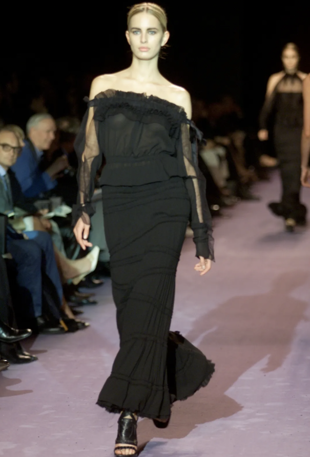 Plunging necklines, leather trousers, and velvet tuxedos recalled the sensual glamour of icons like Yves Saint Laurent and Halston, as well as the excess of old Hollywood. Ford’s vision drew on the unapologetic glamour of Elizabeth Taylor, the raw magnetism of Marlon Brando, and the gamine modernity of Twiggy, weaving them into a new code for the brand.